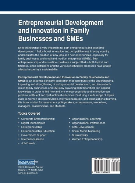 Entrepreneurship is very important for both entrepreneurs and economic development. It helps boost innovation and competitiveness in every country and facilitates the creation of new jobs and new opportunities, especially for family businesses and small and medium enterprises (SMEs). Both entrepreneurship and innovation constitute a subject that is both topical and timeless, since institutions and the various institutional processes have always affected a country's sustainability. Entrepreneurial Development and Innovation in Family Businesses and SMEs is an essential scholarly publication that contributes to the understanding, improving and strengthening of entrepreneurial development, and innovation's role in family businesses and SMEs by providing both theoretical and applied knowledge in order to find how and why entrepreneurship and innovation can produce inefficient and dysfunctional outcomes. Featuring a wide range of topics such as women entrepreneurship, internationalization, and organizational learning, this book is ideal for researchers, policymakers, entrepreneurs, executives, managers, academicians, and students.