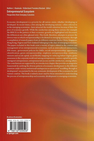 Section 1: Introduction.- Chapter 1. Emerging Economies: Muddling through to Development.- Section 2: Entrepreneurial Ecosystem.- Chapter 2. An Empirical Analysis of the Singapore Entrepreneurship Ecosystem: A Case Study for BRIC Economies to Ponder.- Chapter 3. The Impact of Ethnicity on Entrepreneurship: A Global Review and Lessons for Nigeria.- Chapter 4. Economic Implications of Intellectual Property Rights in Evolving Markets.- Chapter 5. Factors Affecting Capital Structure of Indian Venture Capital backed Growth Firms.- Chapter 6. ridging the Cross Cultural Transformational LI (Distance Measure) at Huawei Technology India Pvt Ltd.- Section 3: Social Networks for Entrepreneurship.- Chapter 7. How Do Entrepreneurs Benefit from their Informal Networks?.- Chapter 8. Opportunity Identification in International Entrepreneurship: The Role of Human and Social Capital.- Chapter 9. Symbiotic Venture and Social Capital: The Effects of Market Orientation on Small Entrepreneur Firms in China.- Chapter 10. Social Fluidity Mapping System A Way to Reduce Social Stigma in Business Failures.- Section 4: Sustainable Entrepreneurship.- Chapter 11. Green Entrepreneurship in India: Global Evaluation, Needs Analysis and Drivers for Growth.- Chapter 12. Green Awareness by Corporates and Entrepreneurs in India: A Case Study of an Indian City.- Chapter 13. Social Entrepreneurship: Building Sustainability through Socially Relevant Business Models.- Section 5: Micro-Entrepreneurship.- Chapter 14. Driving Factors for Entrepreneurship: A Case Study of Immigrant, Ethnic and Religious Minority Entrepreneurs.- Chapter 15. Entrepreneurial Success and Life Satisfaction among Women Micro-Entrepreneurs.