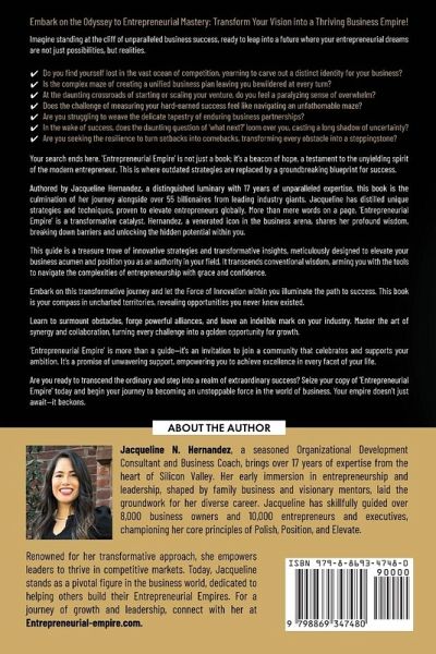 Embark on the Odyssey to Entrepreneurial Mastery: Transform Your Vision into a Thriving Business Empire! ¿¿¿¿ Imagine standing at the cliff of unparalleled business success, ready to leap into a future where your entrepreneurial dreams are not just possibilities, but realities. - Do you find yourself lost in the vast ocean of competition, yearning to carve out a distinct identity for your business? - Is the complex maze of creating a unified business plan leaving you bewildered at every turn? - At the daunting crossroads of starting or scaling your venture, do you feel a paralyzing sense of overwhelm? - Does the challenge of measuring your hard-earned success feel like navigating an unfathomable maze? - Are you struggling to weave the delicate tapestry of enduring business partnerships? - In the wake of success, does the daunting question of what next? loom over you, casting a long shadow of uncertainty? - Are you seeking the resilience to turn setbacks into comebacks, transforming every obstacle into a stepping stone? Your search ends here. Entrepreneurial Empire is not just a book; it's a beacon of hope, a testament to the unyielding spirit of the modern entrepreneur. This is where outdated strategies are replaced by a groundbreaking blueprint for success. Authored by Jacqueline Hernandez, a distinguished luminary with 17 years of unparalleled expertise, this book is the culmination of her journey alongside over 55 billionaires from leading industry giants. Jacqueline has distilled unique strategies and techniques, proven to elevate entrepreneurs globally. More than mere words on a page, Entrepreneurial Empire is a transformative catalyst. Hernandez, a venerated icon in the business arena, shares her profound wisdom, breaking down barriers and unlocking the hidden potential within you. This guide is a treasure trove of innovative strategies and transformative insights, meticulously designed to elevate your business acumen and position you as an authority in your field. It transcends conventional wisdom, arming you with the tools to navigate the complexities of entrepreneurship with grace and confidence. Embark on this transformative journey and let the Force of Innovation within you illuminate the path to success. This book is your compass in uncharted territories, revealing opportunities you never knew existed. Learn to surmount obstacles, forge powerful alliances, and leave an indelible mark on your industry. Master the art of synergy and collaboration, turning every challenge into a golden opportunity for growth. Entrepreneurial Empire is more than a guide-it's an invitation to join a community that celebrates and supports your ambition. It's a promise of unwavering support, empowering you to achieve excellence in every facet of your life. Are you ready to transcend the ordinary and step into a realm of extraordinary success? Seize your copy of Entrepreneurial Empire today and begin your journey to becoming an unstoppable force in the world of business. Your empire doesn't just await-it beckons. Learn more at entrepreneurial-empire.com