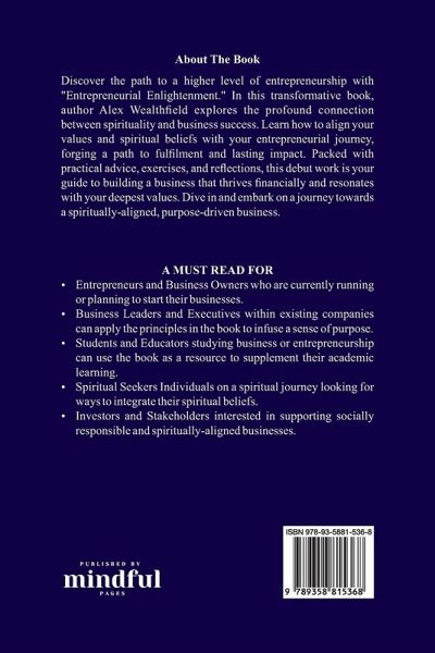 Discover the path to a higher level of entrepreneurship with "Entrepreneurial Enlightenment." In this transformative book, author Alex Wealthfield explores the profound connection between spirituality and business success. Learn how to align your values and spiritual beliefs with your entrepreneurial journey, forging a path to fulfilment and lasting impact. Packed with practical advice, exercises, and reflections, this debut work is your guide to building a business that thrives financially and resonates with your deepest values. Dive in and embark on a journey towards a spiritually-aligned, purpose-driven business. A Must read for:Entrepreneurs and Business Owners who are currently running or planning to start their businesses. Business Leaders and Executives within existing companies can apply the principles in the book to infuse a sense of purpose. Students and Educators studying business or entrepreneurship can use the book as a resource to supplement their academic learning. Spiritual Seekers and individuals on a spiritual journey looking for ways to integrate their spiritual beliefs. Investors and Stakeholders interested in supporting socially responsible and spiritually-aligned businesses.
