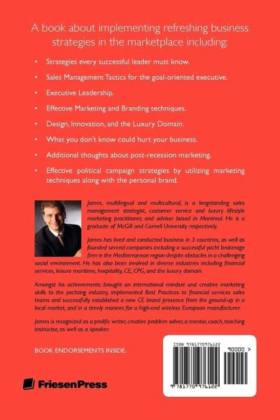 A book about implementing refreshing business strategies in the marketplace including: - Strategies every successful leader must know. - Sales Management Tactics for the goal-oriented executive. - Executive Leadership. - Effective Marketing and Branding techniques - Design, Innovation, and the Luxury Domain. - What you don't know could hurt your business. - Additional thoughts about post-recession marketing - Effective political campaign strategies by utilizing marketing techniques along with the personal brand.