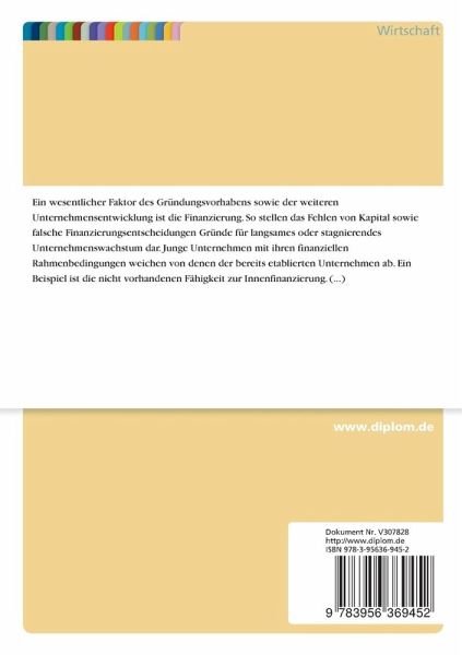 Studienarbeit aus dem Jahr 2014 im Fachbereich BWL - Investition und Finanzierung, Note: 2,0, Georg-August-Universität Göttingen, Sprache: Deutsch, Abstract: Ein wesentlicher Faktor des Gründungsvorhabens sowie der weiteren Unternehmensentwicklung ist die Finanzierung. So stellen das Fehlen von Kapital sowie falsche Finanzierungsentscheidungen Gründe für langsames oder stagnierendes Unternehmenswachstum dar.