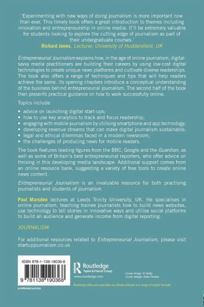 Entrepreneurial Journalism explains how, in the age of online journalism, digital-savvy media practitioners are building their careers by using low-cost digital technologies to create unique news platforms and cultivate diverse readerships. The book also offers a range of techniques and tips that will help readers achieve the same. Its opening chapters introduce a conceptual understanding of the business behind entrepreneurial journalism. The second half of the book then presents practical guidance on how to work successfully online. Topics include: ¿ advice on launching digital start-ups; ¿ how to use key analytics to track and focus readership; ¿ engaging with mobile journalism by utilising smartphone and app technology; ¿ developing revenue streams that can make digital journalism sustainable; ¿ legal and ethical dilemmas faced in a modern newsroom; ¿ the challenges of producing news for mobile readers. The book features leading figures from the BBC, Google and the Guardian, as well as some of Britain's best entrepreneurial reporters, who offer advice on thriving in this developing media landscape. Additional support comes from an online resource bank, suggesting a variety of free tools to create online news content. Entrepreneurial Journalism is an invaluable resource for both practising journalists and students of journalism.