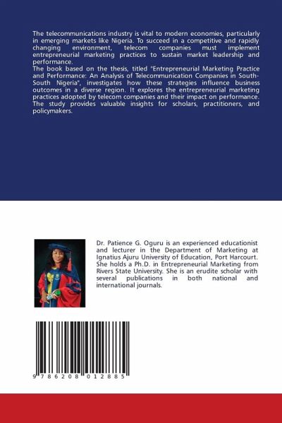 The telecommunications industry is vital to modern economies, particularly in emerging markets like Nigeria. To succeed in a competitive and rapidly changing environment, telecom companies must implement entrepreneurial marketing practices to sustain market leadership and performance.The book based on the thesis, titled "Entrepreneurial Marketing Practice and Performance: An Analysis of Telecommunication Companies in South-South Nigeria", investigates how these strategies influence business outcomes in a diverse region. It explores the entrepreneurial marketing practices adopted by telecom companies and their impact on performance. The study provides valuable insights for scholars, practitioners, and policymakers.