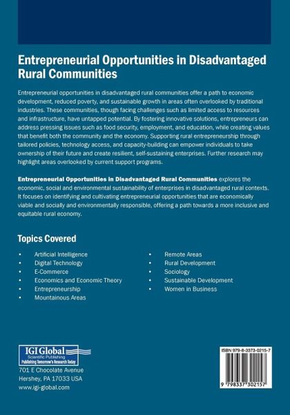 "Entrepreneurship in disadvantaged rural contexts constitutes a benchmark for research to highlight entrepreneurial opportunities towards the specific frame of the aforementioned rural areas. The main purpose of the current book is to highlight the economic, social and environmental sustainability of enterprises in disadvantaged rural contexts"-- Provided by publisher.