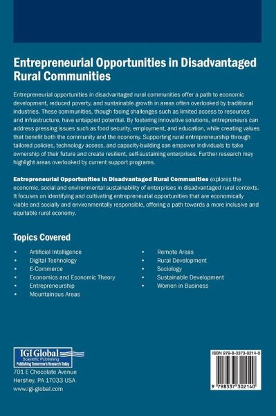 "Entrepreneurship in disadvantaged rural contexts constitutes a benchmark for research to highlight entrepreneurial opportunities towards the specific frame of the aforementioned rural areas. The main purpose of the current book is to highlight the economic, social and environmental sustainability of enterprises in disadvantaged rural contexts"-- Provided by publisher.