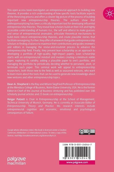 This open access book investigates an entrepreneurial approach to building new theories. It provides a rich understanding of how specific tools facilitate aspects of the theorizing process and offers a clearer big picture of the process of building important new entrepreneurship theories. The authors show that anthropomorphizing has been a critically important tool for developing influential entrepreneurship theories. They reveal how scholars build on their rich and highly accessible understanding of humans (i.e., the self and others) to make guesses and sense of entrepreneurial anomalies, articulate theoretical mechanisms to build more robust entrepreneurship theories, and create plausible stories that facilitate sensegiving. Further, they offer a frameworkthat guides entrepreneurship scholars in finding a balance to maximize their contributions and guides reviewers and editors in managing the revise-and-resubmit process to advance the entrepreneurship field. Finally, they present lean scholarship as an approach to developing a portfolio of high-quality, high-impact papers. Lean scholarship starts with an entrepreneurial mindset and involves creating a minimum viable paper, exploring its validity, adding a plausible paper to one's portfolio, and managing the portfolio by periodically deciding whether to persevere, pivot, or terminate each paper. This seminal work will appeal to entrepreneurship researchers, both those new to the field as well as seasoned veterans, who want to learn more about the tools that can be used to generate new knowledge about new ventures and other entrepreneurship topics.