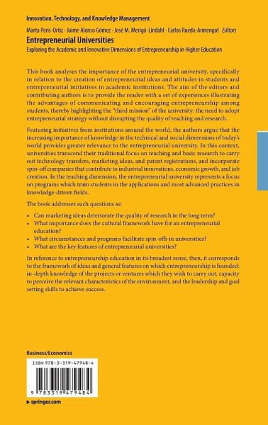 This book analyses the importance of the entrepreneurial university, specifically in relation to the creation of entrepreneurial ideas and attitudes in students and entrepreneurial initiatives in academic institutions. The aim of the editors and contributing authors is to provide the reader with a set of experiences illustrating the advantages of communicating and encouraging entrepreneurship among students, thereby highlighting the "third mission" of the university: the need to adopt entrepreneurial strategy without disrupting the quality of teaching and research.