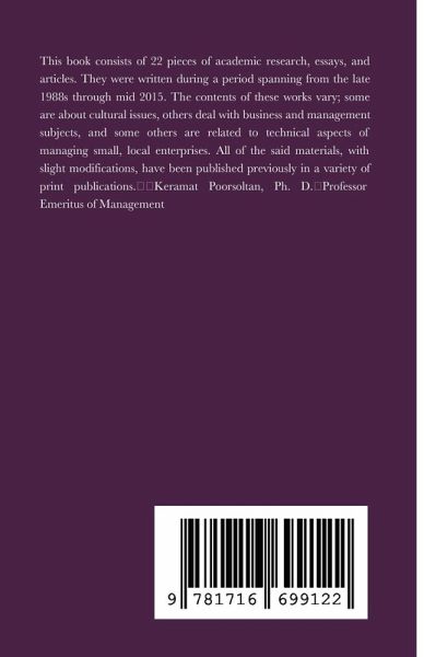 This book consists of 22 pieces of academic research, essays, and articles. They were written during a period spanning from the late 1988s through mid 2015. The contents of these works vary; some are about cultural issues, others deal with business and management subjects, and some others are related to technical aspects of managing small, local enterprises. All of the said materials, with slight modifications, have been published previously in a variety of print publications.