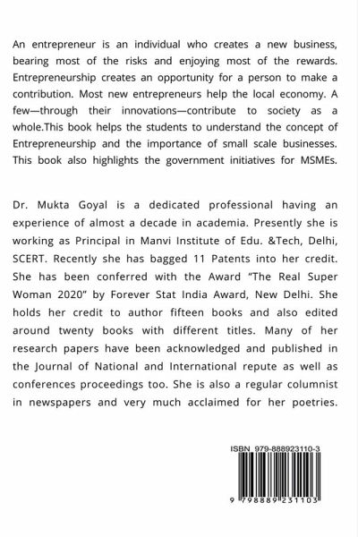 Entrepreneurs are their own bosses. They make the decisions. They choose whom to do business with and what work they will do. They decide what hours to work, as well as what to pay and whether to take vacations. For many entrepreneurs the freedom to control their destiny is enough to outweigh the potential risks. Entrepreneurship creates an opportunity for a person to make a contribution. Most new entrepreneurs help the local economy. A few—through their innovations—contribute to society as a whole.¿¿¿¿¿¿¿ This book helps the students to understand the concept of Entrepreneurship and the importance of small-scale businesses. This book also highlights government initiatives for MSMEs.