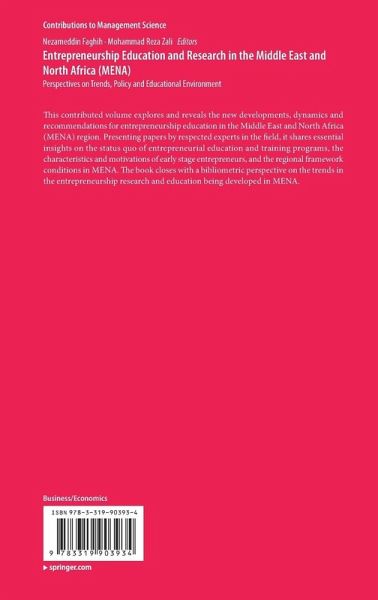 1. Introduction.- Part I. Research by the Global Entrepreneurship Monitor (GEM) in the MENA Region.- 2. Background to the MENA Region.- 3.Entrepreneurical Activity in the MENA region.- 4. Characteristics and Motives of Early-stage Entrepreneurs in the MENA Region.- 5. The MENA Region Entrepreneurial Framework Conditions.- 6. Policy Implications and Recommendations.- Part II. Entrepreneurship Education and Training in MENA.- 7. Entrepreneurship Education and Research in Iran: an Investigation of University of Tehran's Faculty of Entrepreneurship.- 8. University Students' Entrepreneurial Intentions: Does Education Make a Difference?. - 9. Integrated Approach as a Way of Overcoming Entrepreneurship Education Challenges in Elementary Schools in MENA Countries: Evidence from Iran.- 10. Spiritual Intelligence and Social Entrepreneurial Intentions Among Students: The Mediating Role of Entrepreneurial Passion.- 11. Entrepreneurship Education and Training in Saudi Arabia.- 12. PerceptionsTowards Entrepreneurship and Intention to become Entrepreneurs: the Case of Sultan Qaboos University Female Undergraduate Students.- 13. A Journey towards Entrepreneurial Support in Pakistan: IBA's Center for Entrepreneurial Development (CED).- Part III. Entrepreneurship Research in MENA.- 14. A Taxonomic Study of Innovation in the MENA Region Economies: Reflections on Entrepreneurism in Egypt and Qatar.- 15.Entrepreneurship in the Middle East and North Africa: A Bibliometric Analysis.- 16. Entrepreneurship Research in Iran: Current Trends and Future Agendas.- 17. A Review of the Status of Social Entrepreneurship Research and Education in Iran.- 18. Challenges of Entrepreneurial Finance: A Systematic Analysis of Empirical Researches.