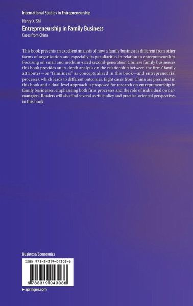 This book presents an excellent analysis of how a family business is different from other forms of organization and especially its peculiarities in relation to entrepreneurship. Focusing on small and medium-sized second-generation Chinese family businesses this book provides an in-depth analysis on the relationship between the firms' family attributes - or "familiness" as conceptualized in this book - and entrepreneurial processes, which leads to different outcomes. Eight cases from China are presented in this book and a dual-level approach is proposed for research on entrepreneurship in family businesses, emphasising both firm processes and the role of individual owner-managers. Readers will also find several useful policy and practice-oriented perspectives in this book.
