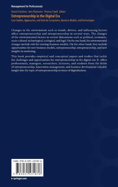 This book provides empirical and conceptual papers and studies that tackle the challenges and opportunities for entrepreneurship in the digital era. It offers professionals, managers, researchers, lecturers, and students from the fields of entrepreneurship, innovation management, and business development valuable insight into the topic of entrepreneurship in times of digitalization.