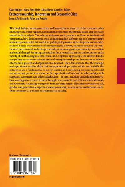 This book looks at entrepreneurship and innovation as ways out of the economic crisis in Europe and other regions, and examines the main theoretical issues and practices related to this analysis. The volume addresses such questions as: From an institutional perspective, how do economic crisis conditions affect different types of entrepreneurs and entrepreneurship? Is it useful for public policymakers and entrepreneurs to understand the basic characteristics of entrepreneurial activity, relations between the institutional environment and entrepreneurship and among entrepreneurship, innovation and social change? Featuring case studies from several industries and countries, and a variety of methodological, theoretical, and empirical approaches, the authors build a compelling narrative on the dynamics of entrepreneurship and innovation as drivers of economic growth and organizational renewal. They demonstrate that the strategic and operational relationships that entrepreneurship creates within and outside the enterprise are a fundamental route for leading and mobilizing economic and social resources that permit innovation at the organizational level and in relationships with suppliers, customers, and other stakeholders - in turn, enabling technological innovation, creating new revenue streams through new productive activities and new demand, and ultimately facilitating emergence from economic crisis. The authors consider social, gender, and generational aspects of entrepreneurship, as well as the institutional conditions necessary to promote entrepreneurial activity.