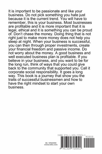 It is important to be passionate and like your business. Do not pick something you hate just because it is the current trend. You will have to remember, this is your business. Most businesses are profitable and it is more important that it is legal, ethical and it is something you can be proud of. Don't chase the money. Doing thing that is not right just to make more money does not help you sleep at night. When your business is successful, you can then through proper investments, create your financial freedom and passive income. Do not worry about the money. A good business and well executed business plan is profitable. If you believe in your business, and you want to be for the long run, think of ways that you could give back to the community that supported you. Call it corporate social responsibility. It goes a long way. This book is a journey that show you the traits of successful businessmen and how to have the right mindset to start your own business.