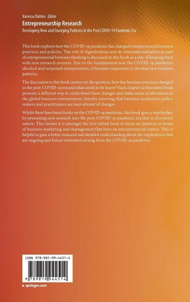 This book explores how the COVID-19 pandemic has changed entrepreneurial business practices and policies. The role of digitalization and de-internationalisation as part of entrepreneurial business thinking is discussed in this book as a way of keeping track with new research avenues. Due to the fundamental way the COVID-19 pandemic shocked and surprised entrepreneurs, it becomes important to develop new business patterns.
