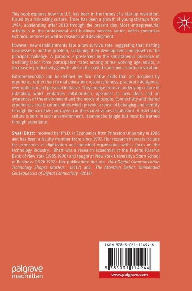 This book explores how the U.S. has been in the throes of a startup revolution, fueled by a risk-taking culture. There has been a growth of young startup from 1994, accelerating after 2010 through the present day. Most entrepreneurial activity is in the professional and business services sector, which comprises technical services as well as research and development.