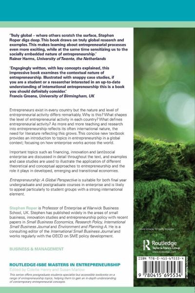 Entrepreneurs exist in every country but the nature and level of entrepreneurial activity differs remarkably. Why is this? What shapes the level of entrepreneurial activity in each country? What defines entrepreneurial activity? As more and more teaching and research into entrepreneurship reflects its often international nature, the need for literature reflecting this grows. This concise new textbook provides an introduction to topics in entrepreneurship in a global context; focusing on how enterprise works across the world. Important topics such as financing, innovation and (anti) social enterprise are discussed in detail throughout the text and examples and case studies are used to illustrate the application of different theoretical and conceptual approaches to entrepreneurship and the role it plays in developed, emerging and transitional economies. Entrepreneurship: A Global Perspective is suitable for both final year undergraduate and postgraduate courses in enterprise and is likely to appeal particularly to student groups with a strong international element.