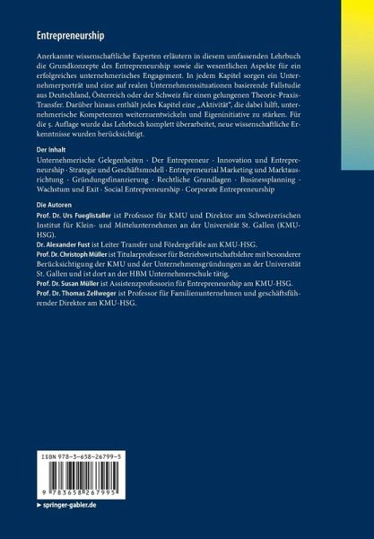 Grundlagen.- Unternehmerische Gelegenheiten.- Der Entrepreneur.- Innovation und Entrepreneurship.- Strategie und Geschäftsmodell.- Entrepreneurial Marketing und Marktausrichtung.- Gründungsfinanzierung.- Rechtliche Grundlagen.- Businessplanning.- Wachstum und Exit.- Social Entrepreneurship.- Corporate Entrepreneurship.