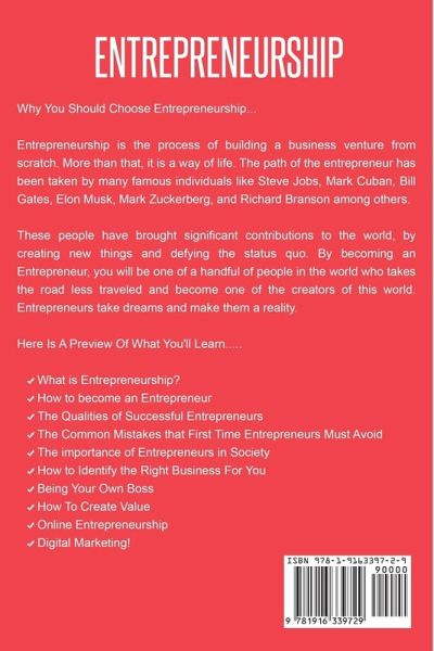 Entrepreneurship Entrepreneurship is the process of building a business venture from scratch. More than that, it is a way of life. By becoming an entrepreneur, you will be one of a handful of people in the world who takes the road less traveled and become one of the creators of this world. Entrepreneurs take dreams and make them a reality. Here is a preview of what you'll learn: What Is Entrepreneurship? How to Become an Entrepreneur The Qualities of Successful Entrepreneurs The Common Mistakes That First Time Entrepreneurs Must Avoid The Importance of Entrepreneurs in Society How to Identify the Right Business for You