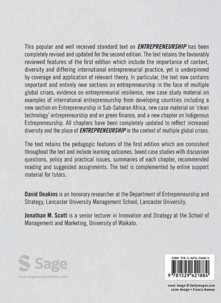 This popular and well received standard text on Entrepreneurship has been completely revised and updated for the second edition. The text retains the favourably reviewed features of the first edition which include the importance of context, diversity and differing international entrepreneurial practice, yet is underpinned by coverage and application of relevant theory. In particular, the text now contains important and entirely new sections on entrepreneurship in the face of multiple global crises, evidence on entrepreneurial resilience, new case study material on examples of international entrepreneurship from developing countries including a new section on Entrepreneurship in Sub-Saharan Africa, new case material on 'clean technology' entrepreneurship and on green finance, and a new chapter on Indigenous Entrepreneurship. All chapters have been completely updated to reflect increased diversity and the place of Entrepreneurship in the context of multiple global crises. The text retains the pedagogic features of the first edition which are consistent throughout the text and include learning outcomes, boxed case studies with discussion questions, policy and practical issues, summaries of each chapter, recommended reading and suggested assignments. The text is complemented by online support material for tutors.