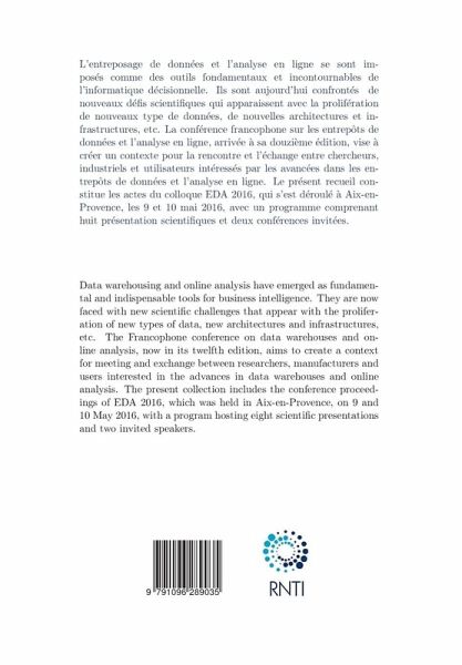 L'entreposage de données et l'analyse en ligne se sont imposées comme des outils fondamentaux et incontournables de l'informatique décisionnelle. Ils sont aujourd'hui confrontés à de nouveaux défis scientifiques qui apparaissent avec la prolifération de nouveaux type de données, de nouvelles architectures et infrastructures, etc. La conférence francophone sur les entrepôts de données et l'analyse en ligne, arrivée à sa douzième édition, vise à créer un contexte pour la rencontre et l'échange entre chercheurs, industriels et utilisateurs intéressés par les avancées dans les entrepôts de données et l'analyse en ligne. Le présent recueil constitue les actes du colloque EDA 2016, qui s'est déroulé à Aix-en-Provence, les 9 et 10 mai 2016, avec un programme comprenant huit présentation scientifiques et deux conférences invitées.