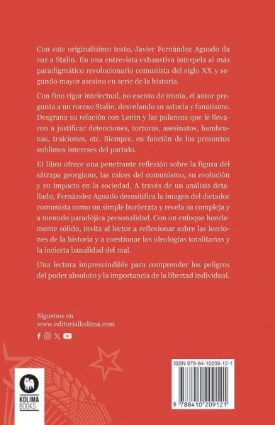 En este interesantísimo libro, Javier Fernández Aguado ha dado voz al sátrapa Stalin. En una entrevista exhaustiva interpela al más paradigmático revolucionario comunista del siglo XX y segundo mayor asesino en serie de la historia. Con fino rigor intelectual, no exento de ironía en algunos pasajes, el autor pregunta a un rocoso Stalin, revelando su astucia y fanatismo, y desgranando el existir de su predecesor Lenin y las palancas que lo llevaron a justificar detenciones, torturas, asesinatos, hambrunas, traiciones, etc., siempre en función de los presuntos sublimes intereses del partido comunista. A través de un análisis detallado, el autor desmitifica la imagen del dictador comunista como un simple burócrata. Con un enfoque crítico pero objetivo, invita al lector a reflexionar sobre las lecciones aprendidas de la historia y a cuestionar las ideologías totalitarias.