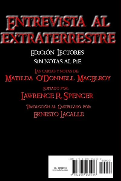 El contenido de este libro esta principalmente extraído de la carta, transcripciones de entrevistas y notas personales, que he recibido de la última Matilda O'Donnell MacElroy. En su carta, me asegura que éste material está basado en su recuerdo de la comunicación con un ser extraterrestre, que "hablo" con ella telepáticamente. Durante julio y agosto de 1947 se entrevistó con un ser extraterrestre que ella identifica como "Airl", quien dice que fue y sigue siendo un oficial, piloto e ingeniero que sobrevivió al accidente de un platillo volante que se estrelló cerca de Roswell, Nuevo México, en julio 8, 1947. Esta EDICION especial LECTORES de ENTREVISTA AL EXTRATERRESTRE,(sin las notas al pie) incluye únicamente las notas originales, las notas personales escritas por Matilde MacElroy O'Donnell, y una copia de las transcripciones Ultra Secretas de las Entrevistas Oficiales de la Fuerza Aérea del Ejercito de los EEUU recibidas de Matilde en 2007.
