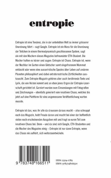 Entropie, das Magazin für erzählende Medien nimmt Medien jeglicher Form und fasst sie zu einem Sammelsurium des narrativen Schaffens zusammen. Egal ob Kurzgeschichten, Fotografie, Lyrik, Illustrationen, Comics, Kurzfilme oder multimediale Installationen. Alles was etwas zu erzählen hat, ist erwünscht.