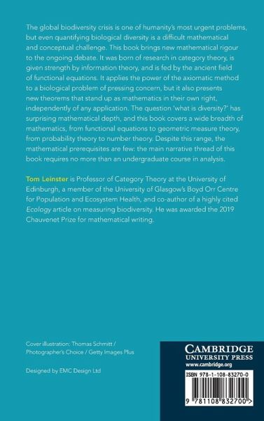 The biodiversity crisis is one of our most urgent problems. This book develops the mathematics behind the measurement of diversity, spanning a great breadth of subjects: from geometry to logic, from algebra to probability theory. The mathematical prerequisites are few, accessible to mathematicians and biologists with a mathematical background.