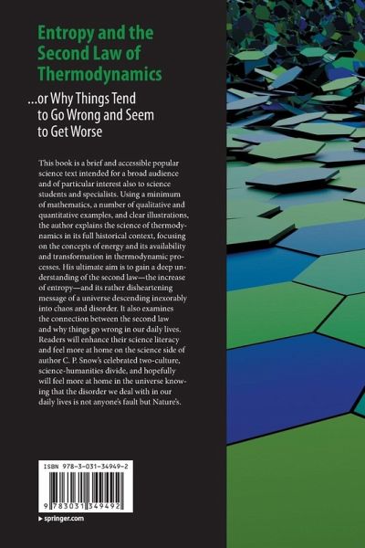This book is a brief and accessible popular science text intended for a broad audience and of particular interest also to science students and specialists. Using a minimum of mathematics, a number of qualitative and quantitative examples, and clear illustrations, the author explains the science of thermodynamics in its full historical context, focusing on the concepts of energy and its availability and transformation in thermodynamic processes. His ultimate aim is to gain a deep understanding of the second law-the increase of entropy-and its rather disheartening message of a universe descending inexorably into chaos and disorder. It also examines the connection between the second law and why things go wrong in our daily lives. Readers will enhance their science literacy and feel more at home on the science side of author C. P. Snow's celebrated two-culture, science-humanities divide, and hopefully will feel more at home in the universe knowing that the disorder we deal with in our daily lives is not anyone's fault but Nature's.
