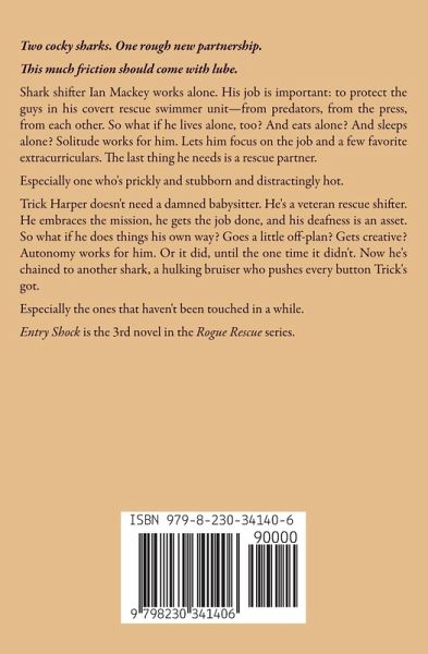 Shark shifter Mackey doesn't need a rescue partner, especially one as reckless and hot as this new shark. Trick's just begging for discipline, and Mackey's willing to break him down. But doing so could threaten his own carefully constructed defenses. + Shark shifter Ian Mackey works alone. His job is important: to protect the guys in his covert rescue swimmer unit-from predators, from the press, from each other. So what if he lives alone, too? And eats alone? And sleeps alone? Solitude works for him. Lets him focus on the job and a few favorite extracurriculars. The last thing he needs is a rescue partner. Especially one who's prickly and stubborn and distractingly hot. And who intends to evade Mackey in the water and out. Trick Harper doesn't need a damned babysitter. He's a veteran rescue shifter. He embraces the mission, he gets the job done, and his deafness is an asset. So what if he does things his own way? Goes a little off-plan? Gets creative? Autonomy works for him. Or it did, until the one time it didn't. Now he's chained to another shark, a hulking bruiser who pushes every button Trick's got. Especially the ones that haven't been touched in a while. If Mackey takes matters into his big, scarred hands, ignoring him is going to be impossible. + ENTRY SHOCK is the 3rd novel in the ROGUE RESCUE series. Content Notes: internal & external ableism; graphic injury; depictions of sea rescues; killing of wild sharks; killing in self-defense; memory of parental death
