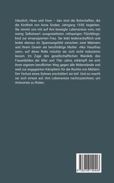 Hässlich, Hexe, Hure - das sind die Botschaften, die die Kindheit von Anna Gruber, Jahrgang 1938. Begleiten Sie uns mit auf ihre bewegte Lebensreise, vom mit wenig Selbstwert ausgestatteten rothaarigen Flüchtlingskind zur emanzipierten Frau. Sie liebt leidenschaftlich und leidet ebenso im Spannungsfeld zwischen zwei Männern und ihrem Dasein als berufstätige Mutter. "Nur Hausfrau sein", auf diese Rolle möchte sie sich nicht reduzieren lassen. Im Zuge des gesellschaftlichen Wandels des Frauenbildes der 60er und 70er Jahre, erkämpft sie sich ihren eigenen beruflichen Weg gegen alle Widerstände. Sie wird zur engagierten Kämpferin für die Rechte von Müttern. Der Verlust eines Sohnes erschüttert sie tief. Und so macht sie sich erneut auf, ihre Lebensreise nachzuzeichnen, um Antworten zu finden.