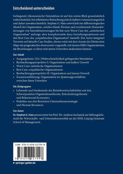 Gelingende (ökonomische) Interaktion ist auf den ersten Blick grundsätzlich wahrscheinlich; bei reflektierter Betrachtung jedoch äußerst voraussetzungsreich und daher unwahrscheinlich. Stephan G. Hans entwickelt ein differenzlogisches Modell der Organisation, welches blinde Flecken und resultierende Herausforderungen von Interaktionsversagen bis hin zum Worst Case der "autistischen Organisation" aufzeigt, aber komplementär dazu Gestaltungsoptionen und den Best Case der "empathischen Organisation" darstellt. Der Autor integriert Verweise auf aktuelle Case Studies, ebenso wird mit dem Ansatz der Distinction Maps ein pragmatisches Instrument vorgestellt, mit dessen Hilfe Organisationen die Beziehungen zu ihren relevanten Umwelten analysieren können.