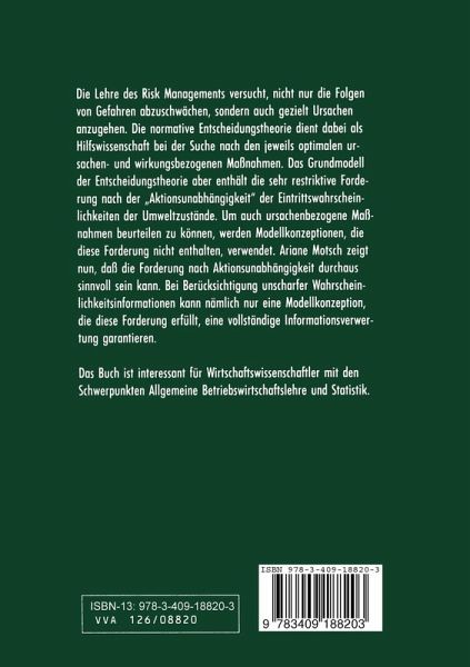 Die Lehre des Risk Managements versucht, nicht nur die Folgen von Gefahren abzuschwächen, sondern auch gezielt Ursachen anzugehen. Die normative Entscheidungstheorie dient dabei als Hilfswissenschaft bei der Suche nach den jeweils optimalen ursachen- und wirkungsbezogenen Maßnahmen. Das Grundmodell der Entscheidungstheorie aber enthält die sehr restriktiven Forderungen nach der "Aktionsunabhängigkeit" der Eintrittswahrscheinlichkeiten der Umweltzustände. Um auch ursachenbezogene Maßnahmen beurteilen zu können, werden Modellkonzeptionen, die diese Forderung nicht enthalten, verwendet. Ariane Motsch zeigt nun,daß die Forderung nach Aktionsunabhängigkeit durchaus sinnvoll sein kann. Bei Berücksichtigung unscharfer Wahrscheinlichkeitsinformationen kann nämlich nur eine Modellkonzeption , die diese Forderung erfüllt, eine vollständige Informationsverwertung garantieren. Verzeichnis: Das Grundmodell der Entscheidungstheorie enthält die sehr restriktive Forderung nach der "Aktionsunabhängigkeit" der Eintrittswahrscheinlichkeiten der Umweltzustände. Es wird gezeigt nun, daß diese Forderung durchaus sinnvoll sein kann. Bei Berücksichtigung unscharfer Wahrscheinlichkeitsinformationen kann nämlich nur eine Modellkonzeption, die diese Forderung erfüllt, eine vollständige Informationsverwertung garantieren.