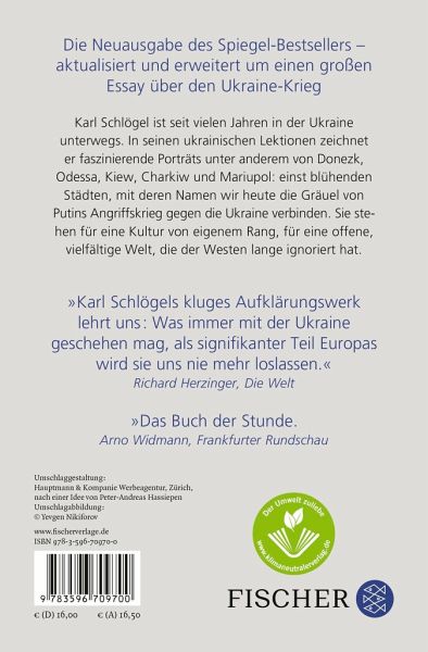 "Das Buch der Stunde. Der erste Satz lautet: 'Wir wissen nicht, wie der Kampf in der Ukraine ausgehen wird; ob sie sich gegen die russische Aggression behaupten oder ob sie in die Knie gehen wird; ob die Europäer, der Westen, sie verteidigen oder sie preisgeben wird, ob die Europäische Union zusammenhalten oder auseinanderfallen wird.' Das ist leider wahr. Schrecklich aber ist: das Buch ist fast sieben Jahre alt." Arno Widmann, Frankfurter Rundschau, 10.03.22 "Eine geglückte Mischung aus Selbstbefragung, Reisereportage und Neuordnung eines über Jahrzehnte angesammelten Wissens." Tobias Rapp, Literatur Spiegel, 31.10.15 "Karl Schlögels kluges Aufklärungswerk lehrt uns: Was immer mit der Ukraine geschehen mag, als signifikanter Teil Europas wird sie uns nie mehr loslassen." Richard Herzinger, Die Welt, 01.10.15 "In seinem neuen Buch setzt Schlögel sich leidenschaftlich und kenntnisreich mit den Gründen und Folgen von Putins Husarenritt auf die Krim und seiner militärischen Einmischung in der Ostukraine auseinander. ... Höchst informative Portraits der wichtigsten ukrainischen Städte. Sie bieten einen anregenden Einblick in die kulturelle und sprachliche Vielfalt des weitläufigen Landes, das für viele Europäer noch immer eine 'terra incognita' darstellt." Reinhard Meier, NZZ am Sonntag, 27.09.15