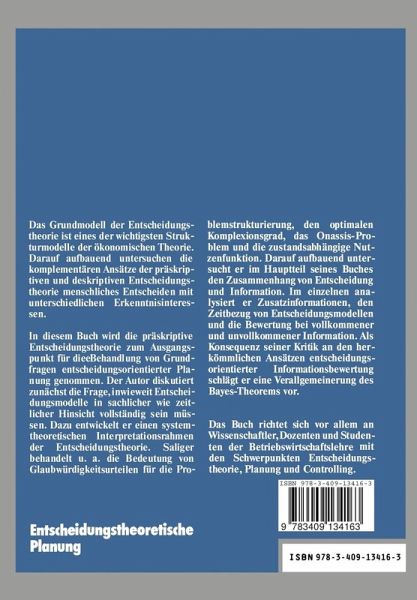 Vorliegende Schrift widmet sich entscheidungstheoretisch orientierter Planung. Sie ist aus der Uberzeugung heraus entstanden, daB die im Grundmodell der Entscheidungstheorie wiedergegebene Denkweise im Prinzip zwar richtig und zweck maBig ist, daB aber zum einen ihr Ausgangspunkt mit der Vor gabe bereits strukturierter Probleme zu wenig Sttitze sein kann auf dem Weg von der Wahrnehmung eines Problems bis zu seiner Formulierung und daB zum anderen ihr Abstraktions niveau zu hoch sei, wodurch ein Zurtickgreifen auf die ei gent lichen EinfluBgroBen von Handlungsergebnissen oft ver hindert werde. Zur Uberwindung dieser Schwachpunkt schlagt der Autor, der mittlerweile tiber langjahrige praktische Er fahrung in der Unternehmensleitung verftigt, eine systemtheo retische Deutung der Elemente des Grundmodells der Entschei dungstheorie und eine Verallgemeinerung des Bayes-Theorems vor. Gleichzeitig stellt die Arbeit eine kritische Sichtung und grtindliche Analyse bestehender Konzeptionen und Losungs vorschlage dar, wobei die Untersuchungen zur zustandsabhan gigen Nutzenfunktion, zum Problem von Lindley, zur Minimax Regret-Regel und zum Wert von Zusatzinformationen besonders zu erwahnen sind. Theoretische Exaktheit und praktische Umsetz- und Anwendbar keit grundmodellorientierter Planung sind das Ziel der Ar beit. Dies macht sie nicht nur ftir den Theoretiker, sondern auch ftir den theoretisch interessierten Praktiker lesenswert. Prof. Dr. Kurt Bohr VORBEMERKUNG Das vorliegende Buch stellt eine aktualisierte Fassung meiner im Sommer 1984 abgeschlossenen Habilitationsschrift mit dem Titel "Grundfragen entscheidungsorientierter Planung" dar.