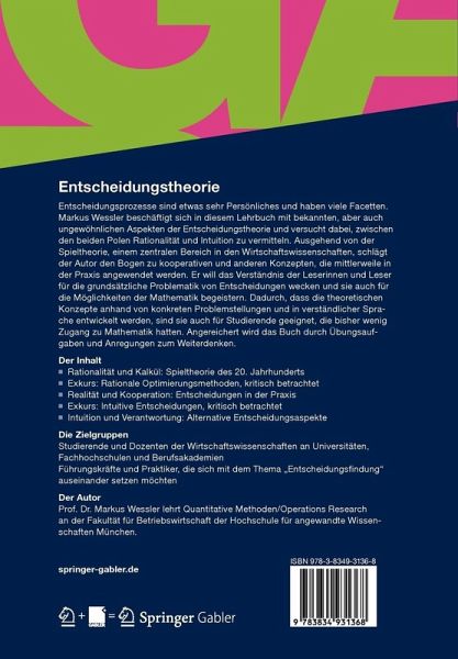 Entscheidungsprozesse sind etwas sehr Persönliches und haben viele Facetten. Markus Wessler beschäftigt sich in diesem Lehrbuch mit bekannten, aber auch ungewöhnlichen Aspekten der Entscheidungstheorie und versucht dabei, zwischen den beiden Polen Rationalität und Intuition zu vermitteln. Ausgehend von der Spieltheorie, einem zentralen Bereich in den Wirtschaftswissenschaften, schlägt der Autor den Bogen zu kooperativen und anderen Konzepten, die mittlerweile in der Praxis angewendet werden. Er will das Verständnis der Leserinnen und Leser für die grundsätzliche Problematik von Entscheidungen wecken und sie auch für die Möglichkeiten der Mathematik begeistern. Dadurch, dass die theoretischen Konzepte anhand von konkreten Problemstellungen und in verständlicher Sprache entwickelt werden, sind sie auch Studierenden geeignet, die bisher wenig Zugang zu Mathematik hatten. Angereichert wird das Buch durch Übungsaufgaben und Anregungen zum Weiterdenken.