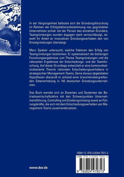 Marc Spieker untersucht, welche Faktoren den Erfolg von Teamgründungen bestimmen. Er systematisiert die bisherigen Forschungsergebnisse zum Thema Teamgründungen und die relevanten Ergebnisse der Entscheidungs- und der Teamforschung. Auf dieser Grundlage entwickelt er eine kommunikationsbasierte Theorie rationalen Entscheidungsverhaltens in strategischen Management-Teams. Seine daraus abgeleiteten Hypothesen überprüft er anhand einer branchenübergreifenden Datenerhebung in 143 deutschen Gründungsunternehmen.