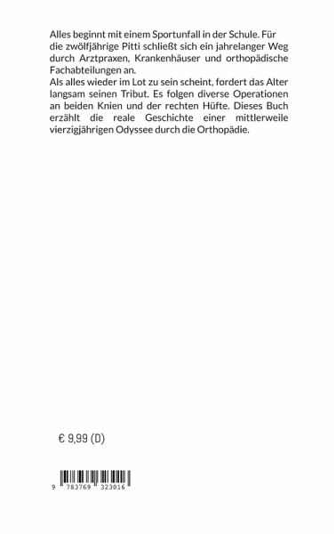 Alles beginnt mit einem Sportunfall in der Schule. Für die zwölfjährige Pitti schließt sich ein jahrelanger Weg durch Arztpraxen, Krankenhäuser und orthopädische Fachabteilungen an. Als alles wieder im Lot zu sein scheint, fordert das Alter langsam seinen Tribut. Es folgen diverse Operationen an beiden Knien und der rechten Hüfte. Dieses Buch erzählt die reale Geschichte einer mittlerweile vierzigjährigen Odyssee durch die Orthopädie.