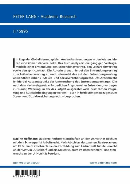 Im Zuge der Globalisierung spielen Auslandsentsendungen in den letzten Jahren eine immer stärkere Rolle. Das Buch analysiert die gängigen Vertragsmodelle einer Entsendung: den Entsendungsvertrag, den Leiharbeitsvertrag sowie den split contract. Die Autorin grenzt hierbei den Entsendungsvertrag zum Leiharbeitsvertrag ab und untersucht das auf den Entsendungsvertrag anwendbare Arbeits-, Steuer- und Sozialversicherungsrecht. Das Arbeitsrecht ist hierbei Ausgangspunkt der Untersuchung des Entsendungsvertrages. Die nach dem Nachweisgesetz erforderlichen Angaben eines Entsendungsvertrages zur Dauer, Währung, in der das Entgelt ausgezahlt wird, zusätzlichen Vergütung und Rückkehrbedingungen werden - auch in fortlaufenden Bezügen zum Steuer- und Sozialversicherungsrecht - besprochen.