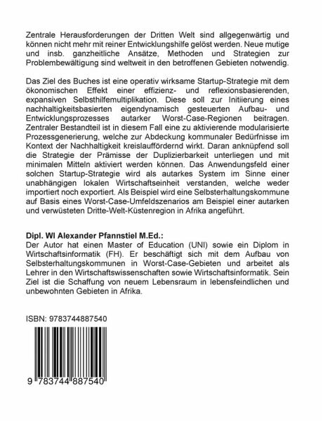 Zentrale Herausforderungen der Dritten Welt sind allgegenwärtig und können nicht mehr mit reiner Entwicklungshilfe gelöst werden. Neue mutige Ansätze, Methoden und Strategien zur Problembewältigung sind weltweit in den betroffenen Gebieten notwendig. Die vielschichtigen Herausforderungen können nur ganzheitlich und verantwortungsvoll gelöst werden.Das Ziel der gegenständlichen Master-Thesis ist eine operativ wirksame Startup-Strategie mit dem ökonomischen Effekt einer effizienz- und reflexionsbasierenden, expansiven Selbsthilfemultiplikation sowie einer portierbaren Lösungsstrategie. Diese soll zur Initiierung eines nachhaltigkeitsbasierten eigendynamisch gesteuerten Aufbau- und Entwicklungsprozesses autarker Worst-Case-Regionen beitragen. Zentraler Bestandteil ist in diesem Fall eine zu aktivierende modularisierte Prozessgenerierung, welche zur Abdeckung kommunaler Bedürfnisse im Kontext der Nachhaltigkeit kreislauffördernd wirkt. Daran anknüpfend soll die Strategie der Prämisseder Duplizierbarkeit unterliegen und mit minimalen Mitteln aktiviert werden können. Das Anwendungsfeld einer solchen Startup-Strategie wird als autarkes System im Sinne einer unabhängigen lokalen Wirtschaftseinheit verstanden, welche weder importiert noch exportiert. Als Beispiel wird eine Selbsterhaltungskommune auf Basis eines Worst-Case-Umfeldszenarios am Beispiel einer autarken und verwüsteten Dritte-Welt-Küstenregion in Afrika angeführt.