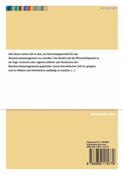 Diplomarbeit aus dem Jahr 2011 im Fachbereich BWL - Marketing, Unternehmenskommunikation, CRM, Marktforschung, Note: 1,7, FOM Hochschule für Oekonomie & Management gemeinnützige GmbH, Hamburg früher Fachhochschule, Sprache: Deutsch, Abstract: Ziel dieser Arbeit soll es sein, ein Bewertungsmodell für das Beschwerdemanagement zu erstellen. Das Modell soll die Wirtschaftspraxis in die Lage versetzen, ihre eigenen Abläufe und Strukturen des Beschwerdemanagements gegenüber einem theoretischen Soll zu spiegeln und so Stärken und Schwächen ausfindig zu machen. Ein solches Mo-dell kann Unternehmen als Grundlage dafür dienen, einen kontinuierlichen Verbesse-rungsprozess mit dem Ziel anzustoßen, die zuvor beschriebenen positiven Effekte des Beschwerdemanagements zu realisieren. Hierzu seien in Kapitel zwei zunächst die begrifflichen Grundlagen des Beschwerde-managements und des EFQM-Modells als bekannter Repräsentant von Selbstbewer-tungsmodellen erläutert. Anschließend beschreibt Kapitel drei den Bedarf für ein Selbstbewertungsmodell des Beschwerdemanagements und welche Anforderungen an ein solches Modell gestellt werden müssen. In Kapitel vier wird das Modell auf Basis der in Kapitel zwei erarbeiteten Grundlagen entworfen, bevor Kapitel fünf die empiri-sche Überprüfung des Modellentwurfes durch Leitfadengespräche mit drei Unterneh-men beschreibt, die das Beschwerdemanagement institutionalisiert haben. Kapitel sechs schildert die Ergebnisse der Leitfadengespräche und erläutert, welche Veränderungen sich hieraus für das Modell ergeben. Kapitel sieben schließt die Arbeit zusammenfas-send ab und gibt einen Ausblick über mögliche weitere Forschungsaufgaben.