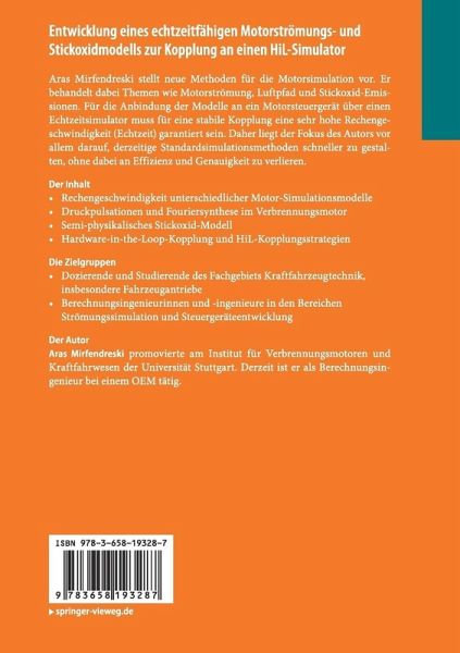 Aras Mirfendreski stellt neue Methoden für die Motorsimulation vor. Er behandelt dabei Themen wie Motorströmung, Luftpfad und Stickoxid-Emissionen. Für die Anbindung der Modelle an ein Motorsteuergerät über einen Echtzeitsimulator muss für eine stabile Kopplung eine sehr hohe Rechengeschwindigkeit (Echtzeit) garantiert sein. Daher liegt der Fokus des Autors vor allem darauf, derzeitige Standardsimulationsmethoden schneller zu gestalten, ohne dabei an Effizienz und Genauigkeit zu verlieren.