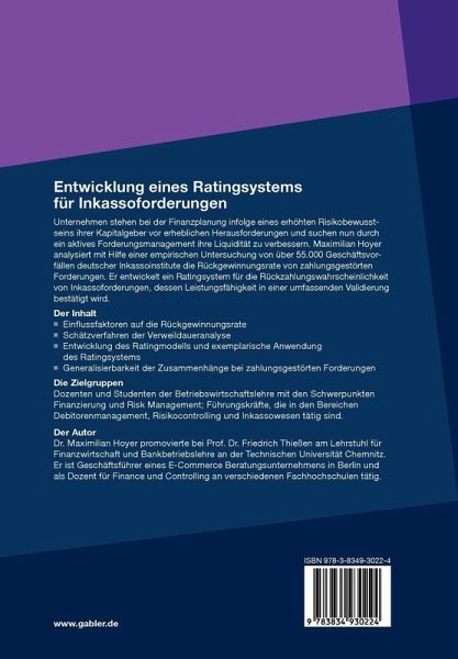 Unternehmen stehen bei der Finanzplanung infolge eines erhöhten Risikobewusstseins ihrer Kapitalgeber vor erheblichen Herausforderungen und suchen nun durch ein aktives Forderungsmanagement ihre Liquidität zu verbessern. Maximilian Hoyer analysiert mit Hilfe einer empirischen Untersuchung von über 55.000 Geschäftsvorfällen deutscher Inkassoinstitute die Rückgewinnungsrate von zahlungsgestörten Forderungen. Er entwickelt ein Ratingsystem für die Rückzahlungswahrscheinlichkeit von Inkassoforderungen, dessen Leistungsfähigkeit in einer umfassenden Validierung bestätigt wird.