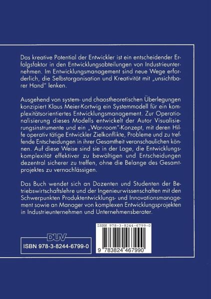 Das kreative Potential der Entwickler ist ein entscheidender Erfolgsfaktor in den Entwicklungsabteilungen von Industrieunternehmen. Im Entwicklungsmanagement sind neue Wege erforderlich, die Selbstorganisation und Kreativität mit "unsichtbarer Hand" lenken. Ausgehend von system- und chaostheoretischen Überlegungen konzipiert Klaus Meier-Kortwig ein Systemmodell für ein komplexitätsorientiertes Entwicklungsmanagement. Zur Operationalisierung dieses Modells entwickelt der Autor Visualisierungsinstrumente und ein "War-room"-Konzept, mit deren Hilfe operativ tätige Entwickler Zielkonflikte, Probleme und zu treffende Entscheidungen in ihrer Gesamtheit veranschaulichen können. Auf diese Weise sind sie in der Lage, die Entwicklungskomplexität effektiver zu bewältigen und Entscheidungen dezentral sicherer zu treffen, ohne die Belange des Gesamtprojektes zu vernachlässigen.