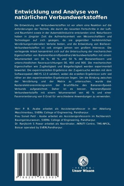 Die Entwicklung von Verbundwerkstoffen ist vor allem eine Reaktion auf die Anforderungen der Technik, die durch die rasanten Fortschritte in der Luft- und Raumfahrt sowie in der Automobilindustrie entstanden sind. Naturfasern haben in jüngster Zeit die Aufmerksamkeit von Wissenschaftlern und Technologen auf sich gezogen, da sie gegenüber herkömmlichen Verstärkungsmaterialien Vorteile bieten, und die Entwicklung von Biofaser-Verbundwerkstoffen ist seit einigen Jahren von großem Interesse. Die vorliegende Arbeit konzentriert sich auf die Untersuchung der mechanischen Eigenschaften von Bananenfasern/Epoxidharz-Verbundwerkstoffen mit einem Volumenanteil von 30 %, 40 % und 50 % der Bananenfasern und unterschiedlichen Faserausrichtungen 00, 450 und 900. Die mechanischen Eigenschaften wie Zugfestigkeit und Biegefestigkeit werden experimentell bewertet. Die experimentellen Ergebnisse der Zugversuche werden mit dem Softwarepaket ANSYS.12.0 validiert, wobei die erzielten Ergebnisse sehr viel näher an den experimentellen Ergebnissen liegen. Um die Bindung zwischen der Verstärkung und der Matrix zu untersuchen, wurde das Rasterelektronenmikrogramm der Bruchfläche des Bananen-Epoxid-Verbunds aufgezeichnet. Daher ist es besser, Bananen/Epoxid-Verbundwerkstoffe mit einem Volumenanteil von 40 % und einer Faserorientierung von 0 Grad für verschiedene Anwendungen zu verwenden.