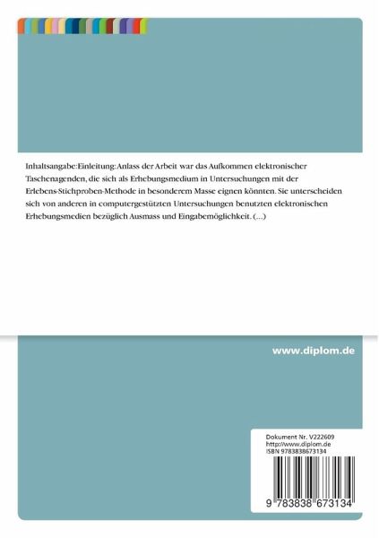 Anlass der Arbeit war das Aufkommen elektronischer Taschenagenden, die sich als Erhebungsmedium in Untersuchungen mit der Erlebens-Stichproben-Methode in besonderem Masse eignen könnten. Sie unterscheiden sich von anderen in computergestützten Untersuchungen benutzten elektronischen Erhebungsmedien bezüglich Ausmass und Eingabemöglichkeit. Die vorliegende Arbeit verfolgte zwei Ziele: Die Entwicklung eines computergestützten Systems zur Anwendung der Erlebens-StichprobenMethode (ESM) mit der elektronischen Taschenagenda Palm III als Erhebungsmedium sowie das Sammeln von praktischen Erfahrungen mit diesem realisierten System, kurz Flexi-ESF (Flexibles System für die Erhebung von Erlebens-Stichproben-Fragebogen) genannt.