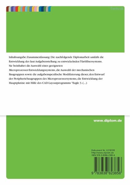 Die nachfolgende Diplomarbeit umfaßt die Entwicklung des laut Aufgabenstellung zu entwickelnden Türöffnersystems. Sie beinhaltet die Auswahl eines geeigneten Microprozessor-Entwicklungssystems, die Auswahl der mechanischen Baugruppen sowie die aufgabenspezifische Modifizierung dieser, den Entwurf der Peripheriebaugruppen des Microprozessorsystems, die Entwicklung der Hauptplatine mit Hilfe des CAD-Layoutprogramms "Eagle 3.0", den Aufbau und die Fertigung des Systems, die Programmierung des Systems in der Programmiersprache Dynamic C sowie die abschließende Dokumentation der Arbeit.