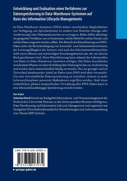 In Data-Warehouse-Systemen (DWS) stehen verschiedene Möglichkeiten zur Verfügung, um Speicherkosten zu senken (wie Nearline-Storage oder Archivierung) oder Datenanalysezeiten zu verringern. Bisher fehlte allerdings ein geeignetes Verfahren, um zu bestimmen, welche Mittel für welche Zwecke und welche Daten eingesetzt werden sollten. Der Bereich der Klassifizierung von DWS-Daten unter der Berücksichtigung von Anwender- und Administratorenwissen, der Leistungsfähigkeit des Systems und auch des Informationslebenszyklus stellt einen offenen und notwendigen Forschungsbereich dar, der mit diesem Buch geschlossen wird. Diese Klassifizierung kann anhand des Lebenszyklus von Daten in Data-Warehouse-Systemen erfolgen. Die Daten durchlaufen verschiedene Phasen von ihrer Erstellung über Nutzung bis hin zur Archivierung und werden darin unterschiedlich häufig verwendet. Nur ein geringer und im Zeitverlauf abnehmender Anteil an Daten eines DWS wird aktiv verwendet. Um eine wirtschaftliche Datenspeicherung zu erreichen, müssen zu jeder Lebenszyklusphase passende Maßnahmen ergriffen werden. Statt einer einheitlichen, phasen-unspezifischen Verwaltung aller DWS-Daten kann so eine lebenszyklusabhängige Speicherung erreicht werden.